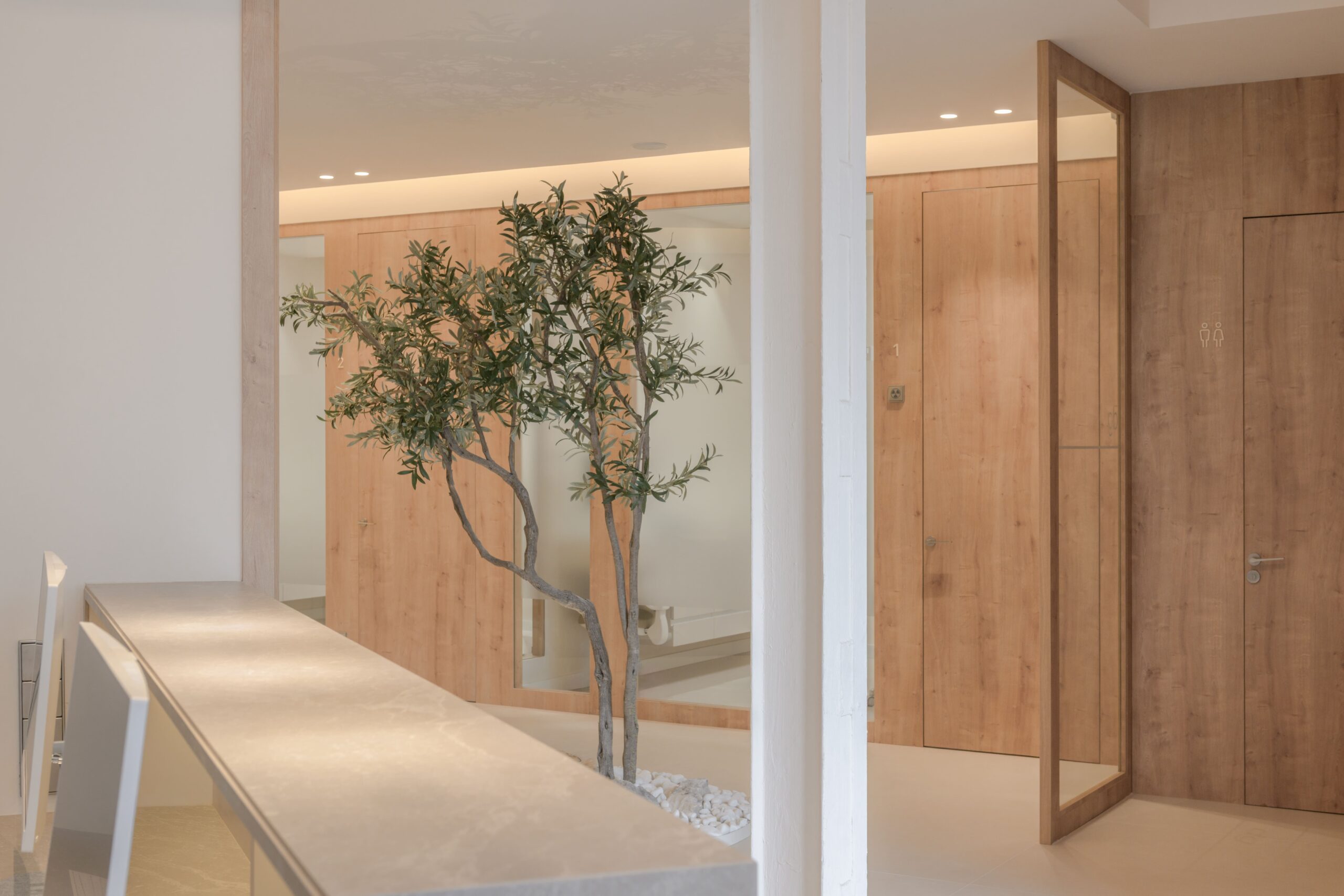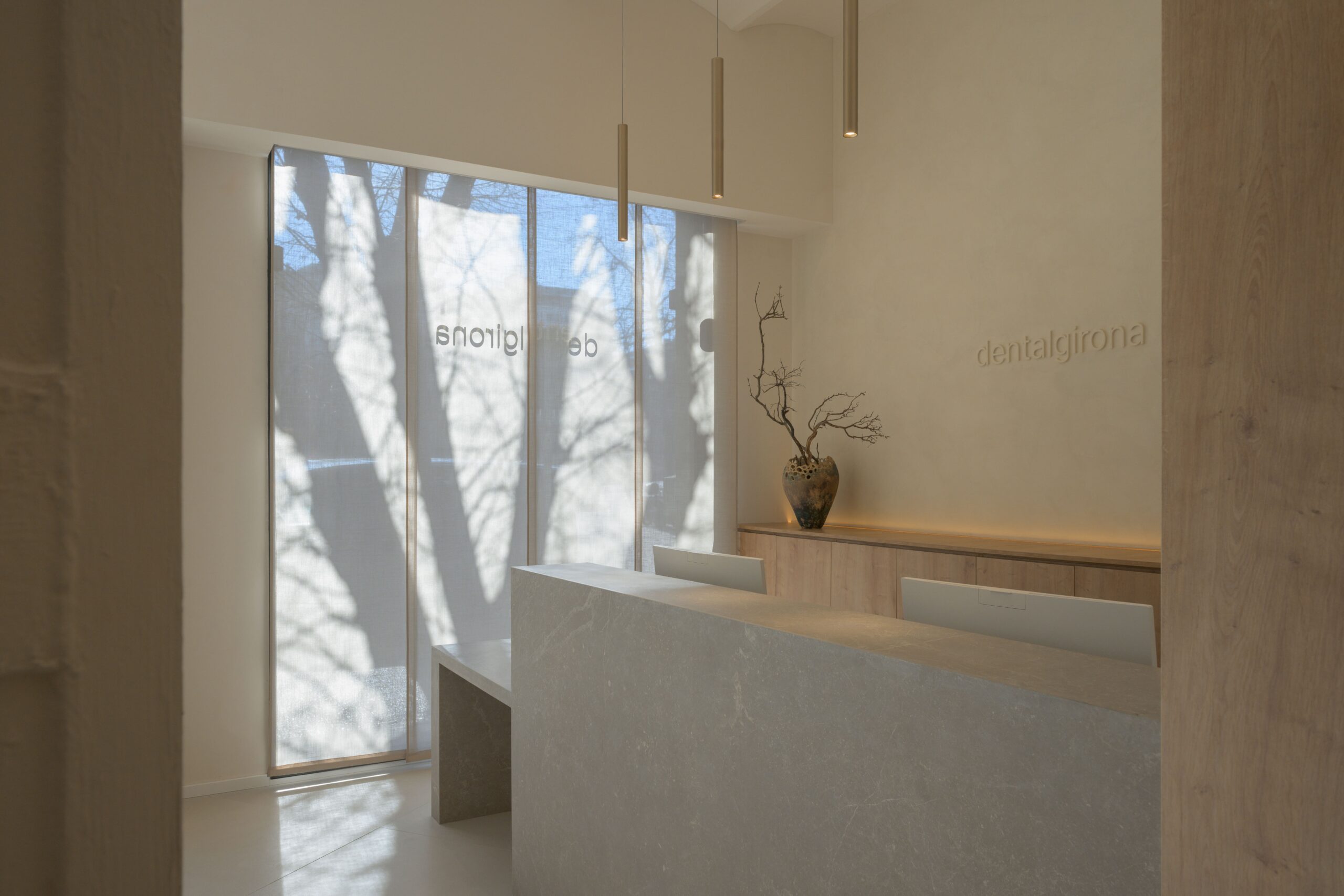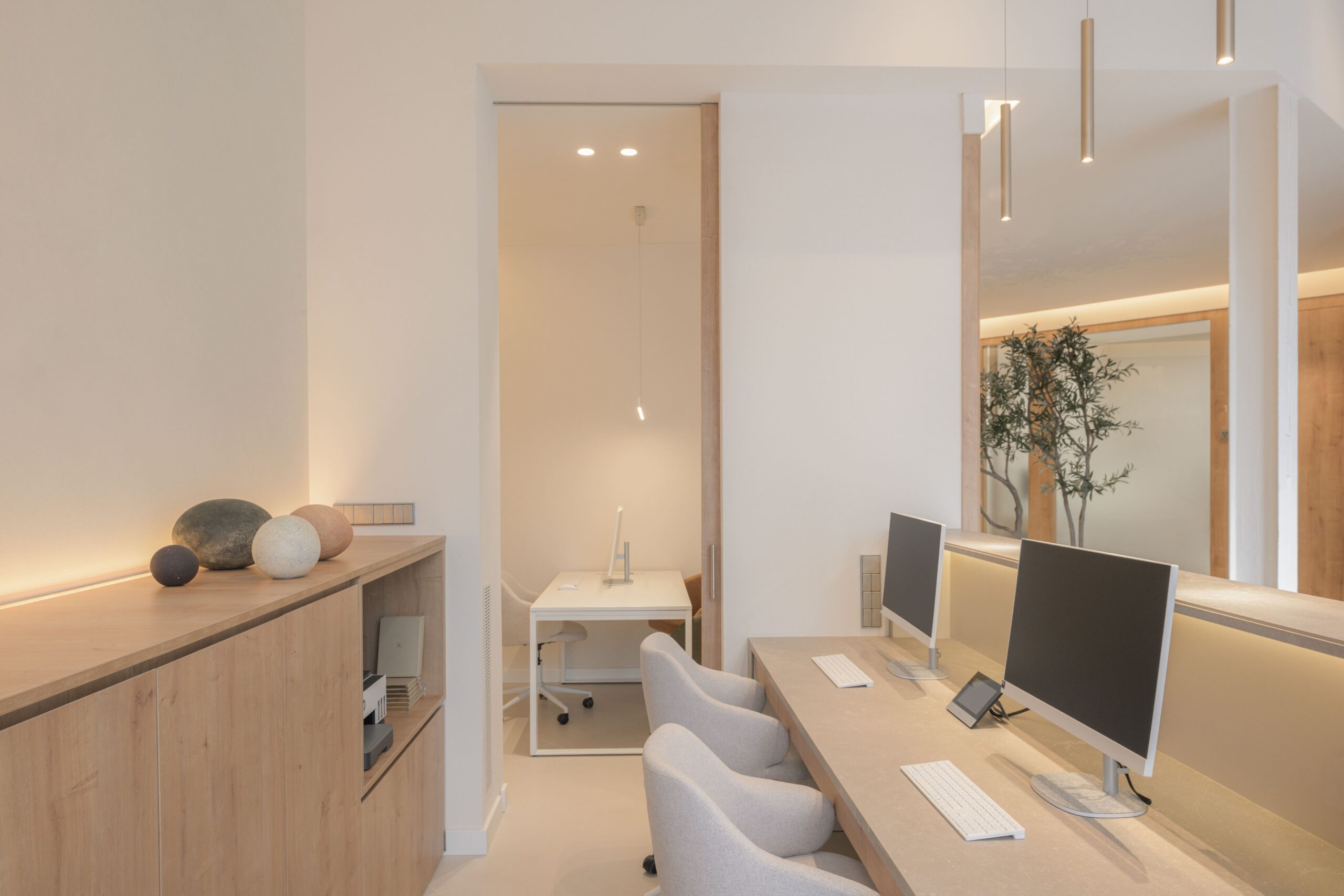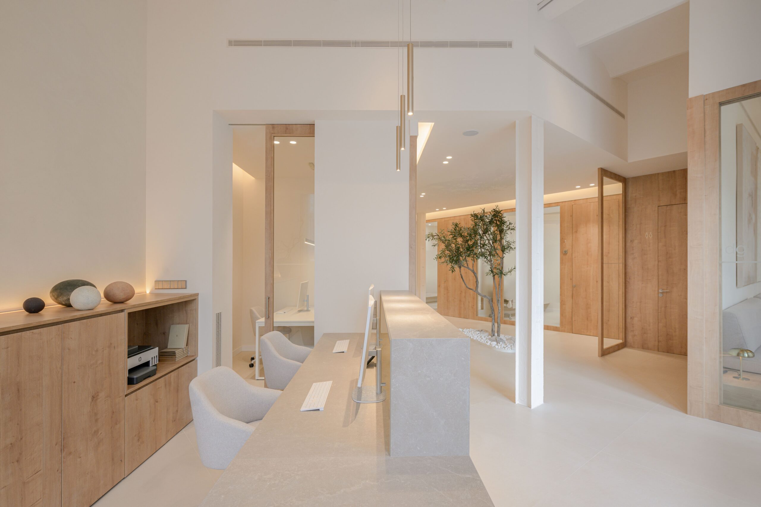 From the entrance, the waiting area is presented as a warm, domestic environment, removed from the conventional clinical character. The reception is articulated through pure volumes and mineral materials, in contrast with the warmth of the surroundings.