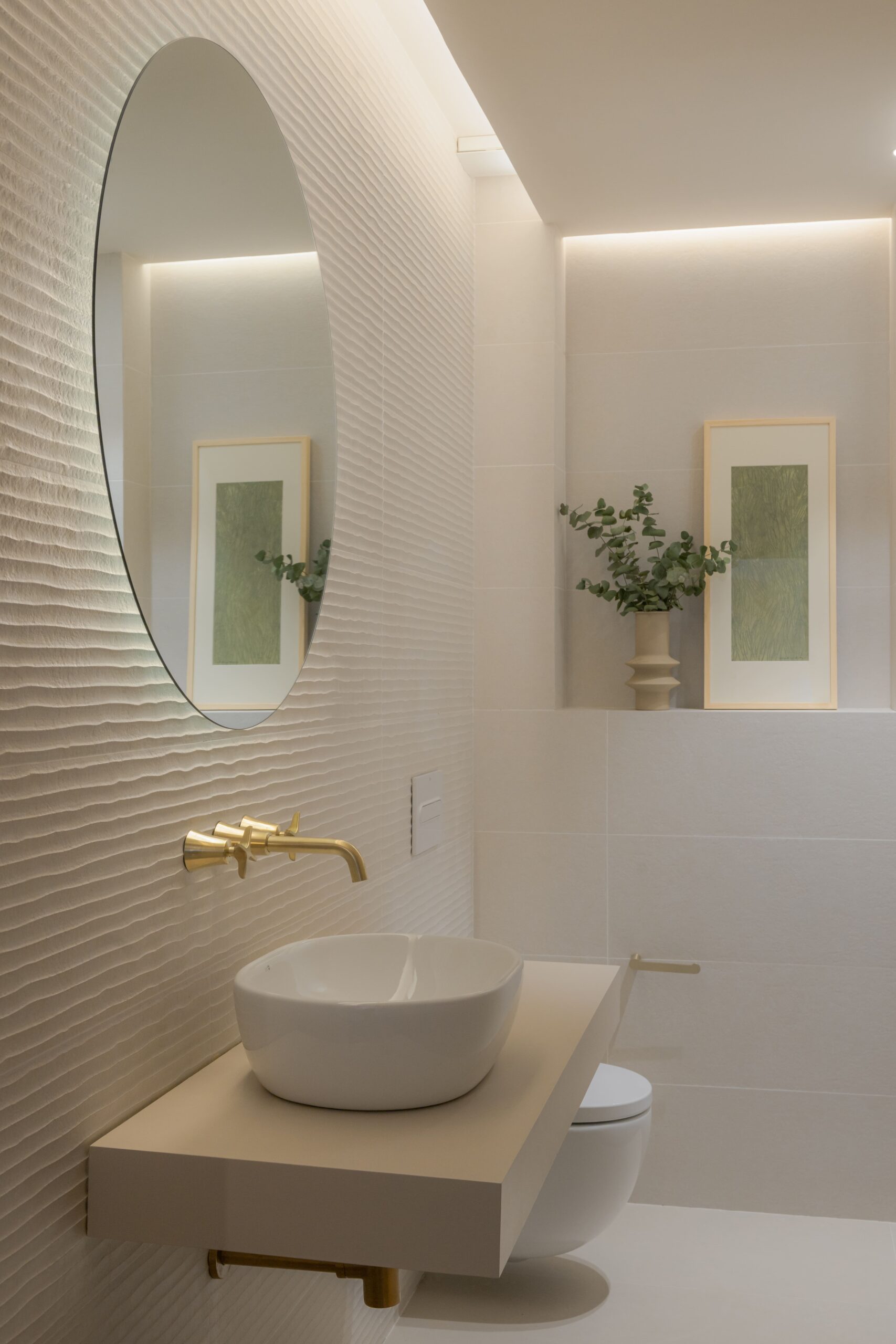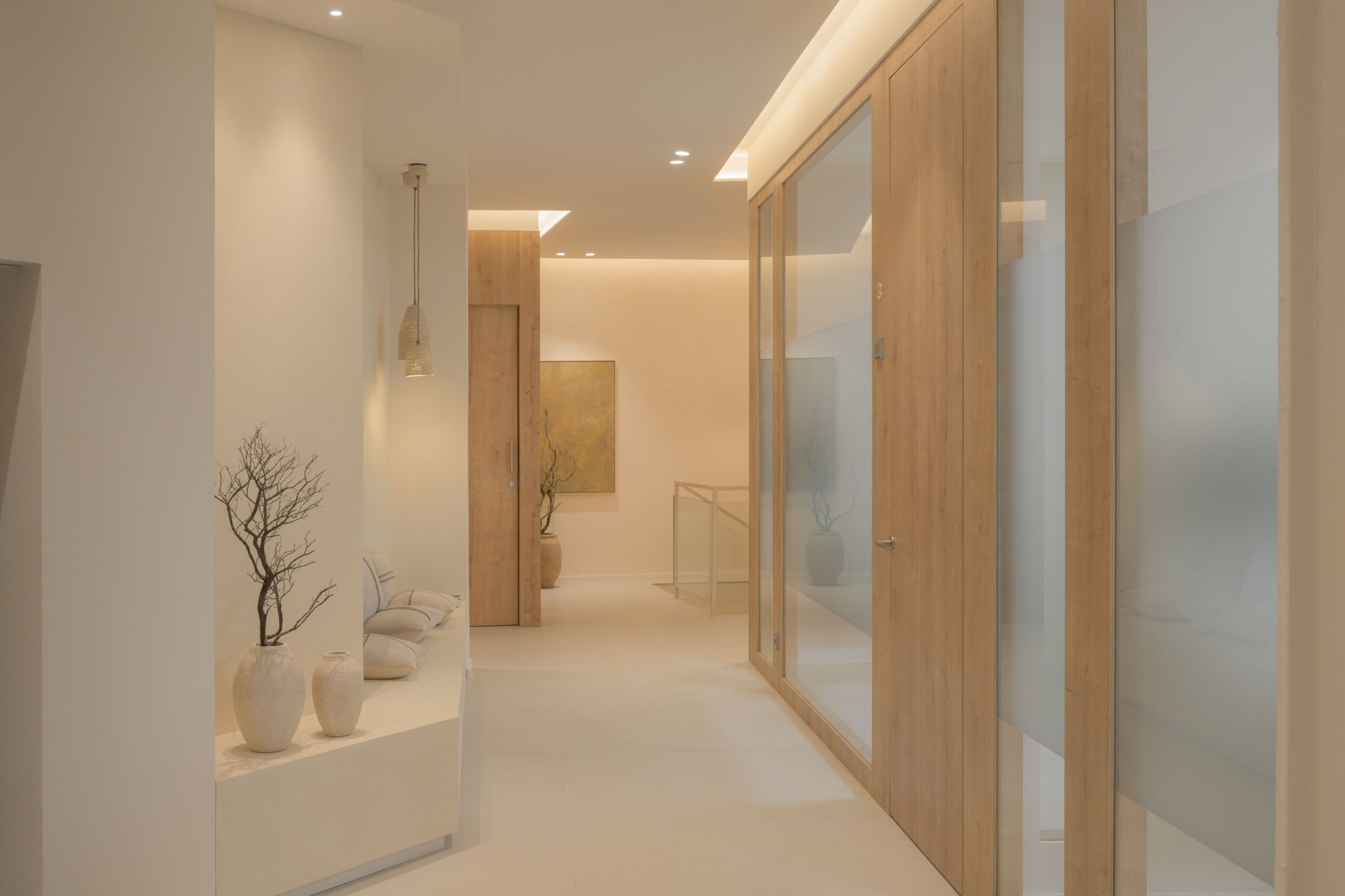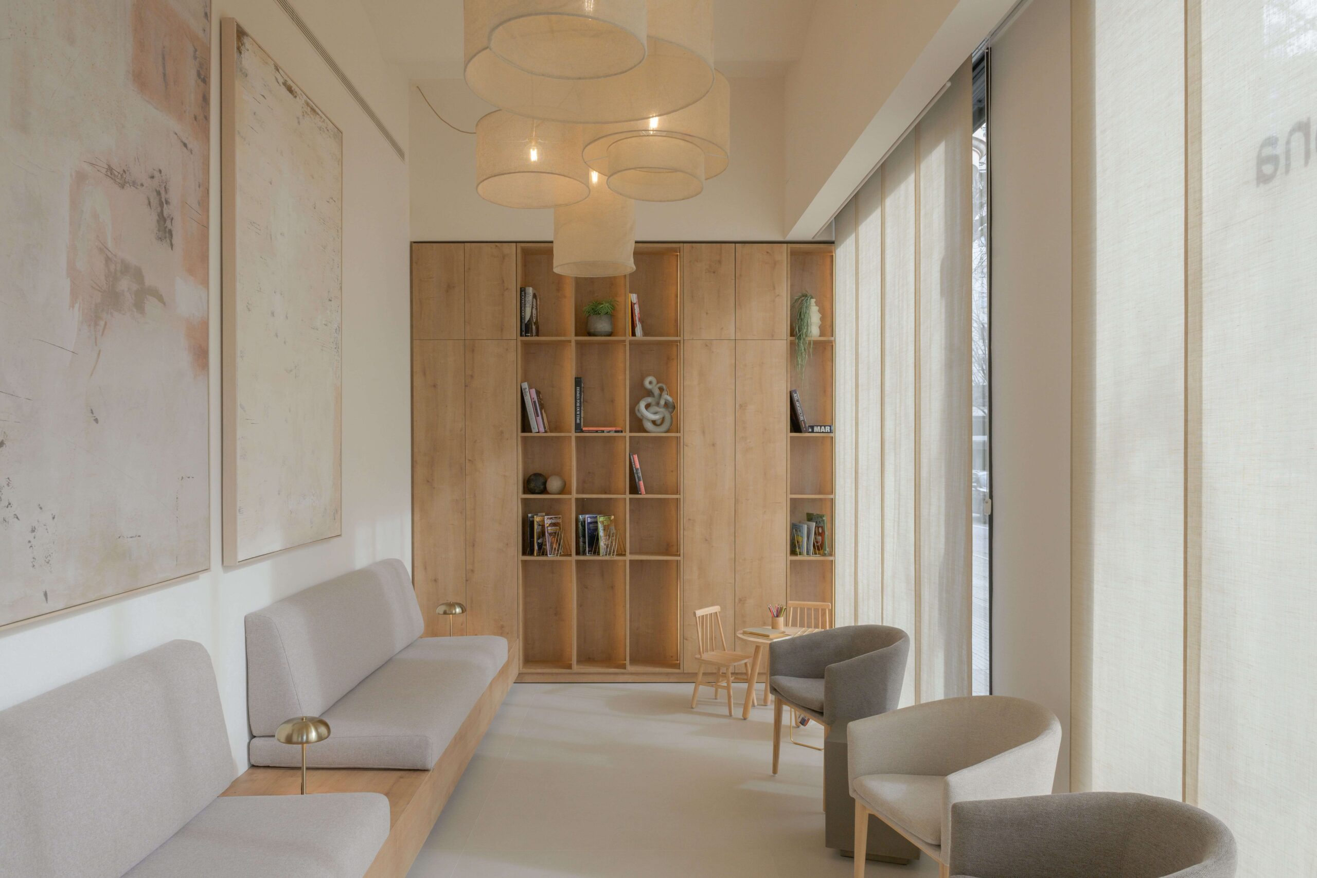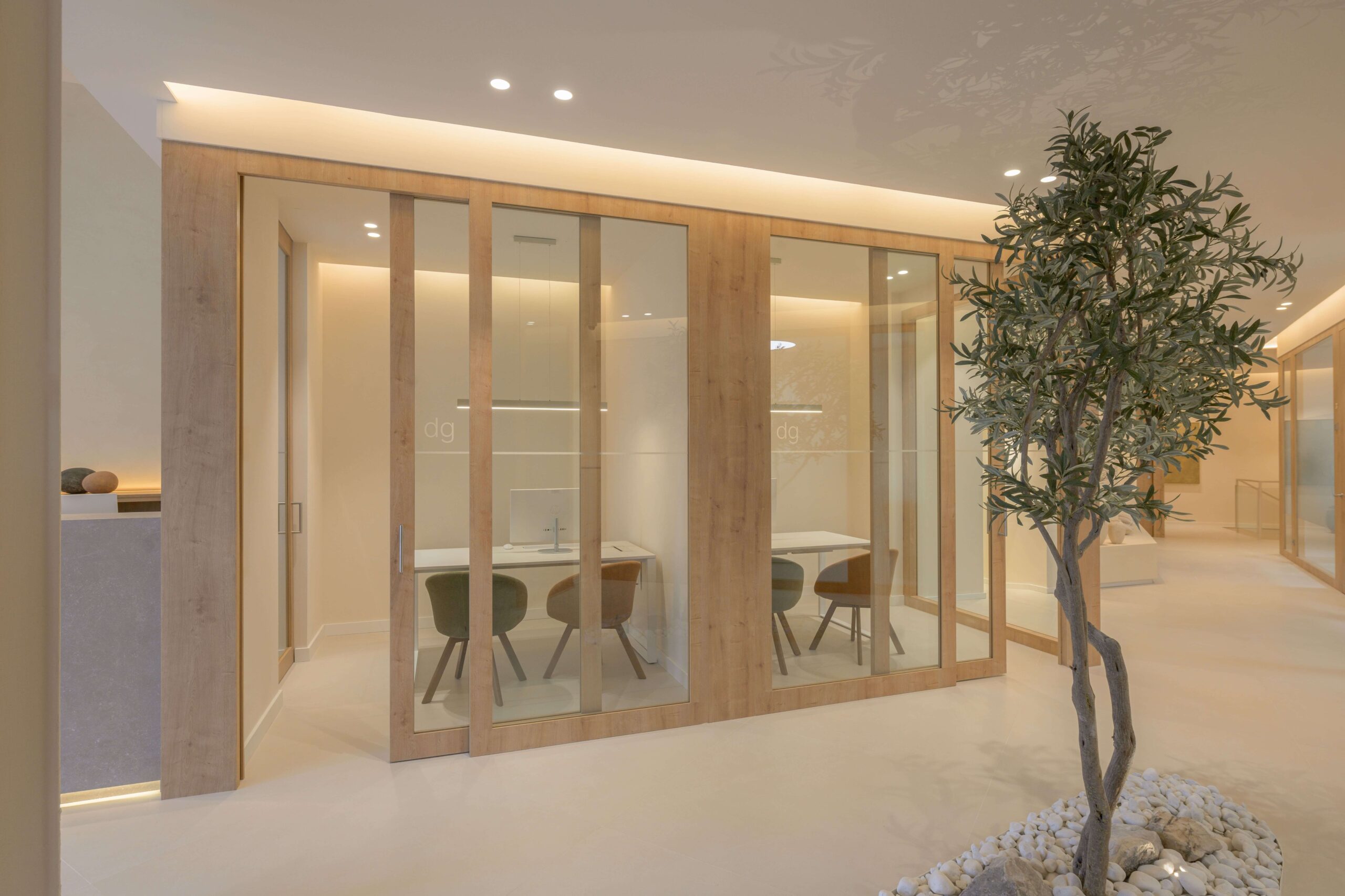 From the entrance, the waiting area is presented as a warm, domestic environment, removed from the conventional clinical character. The reception is articulated through pure volumes and mineral materials, in contrast with the warmth of the surroundings.