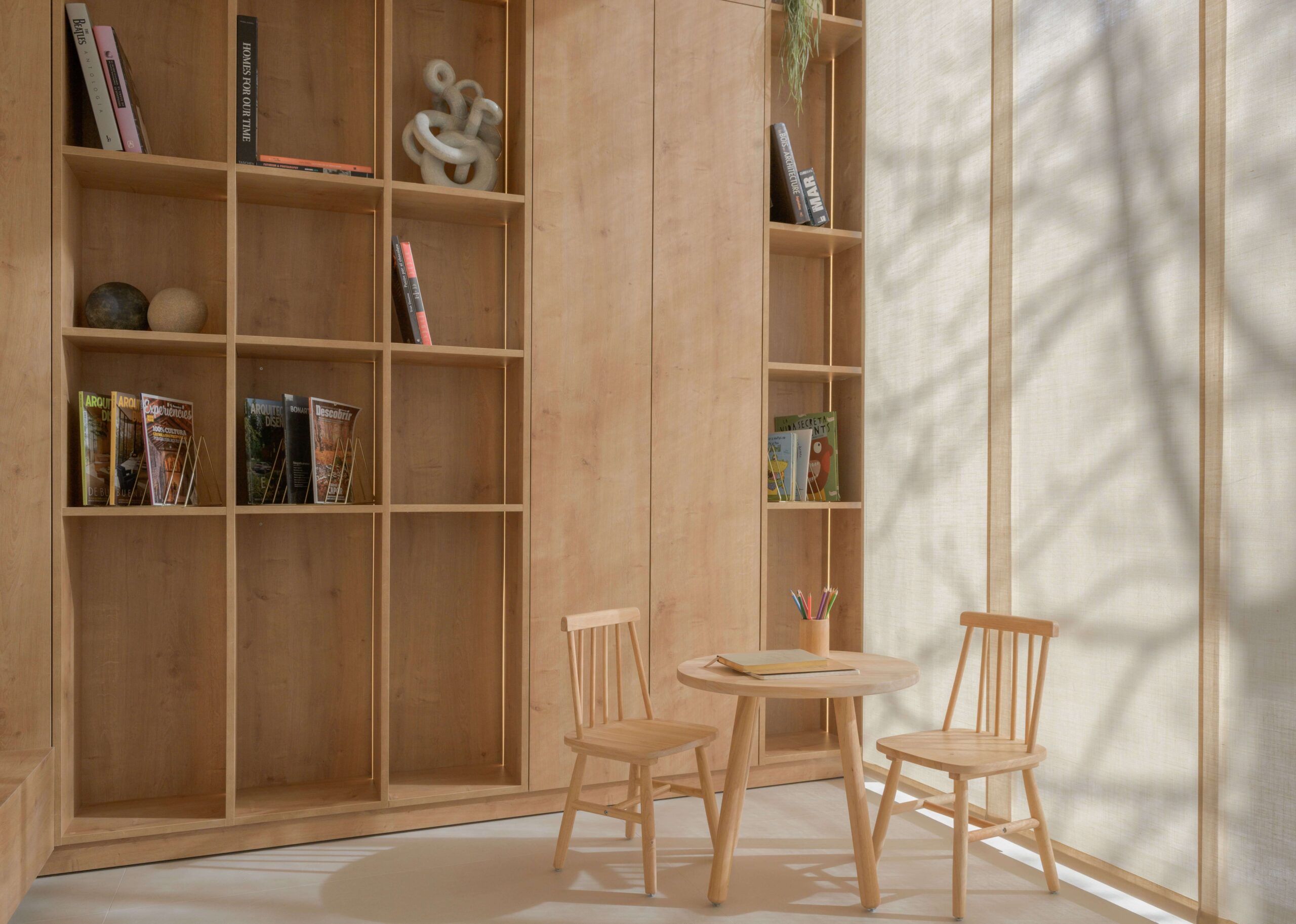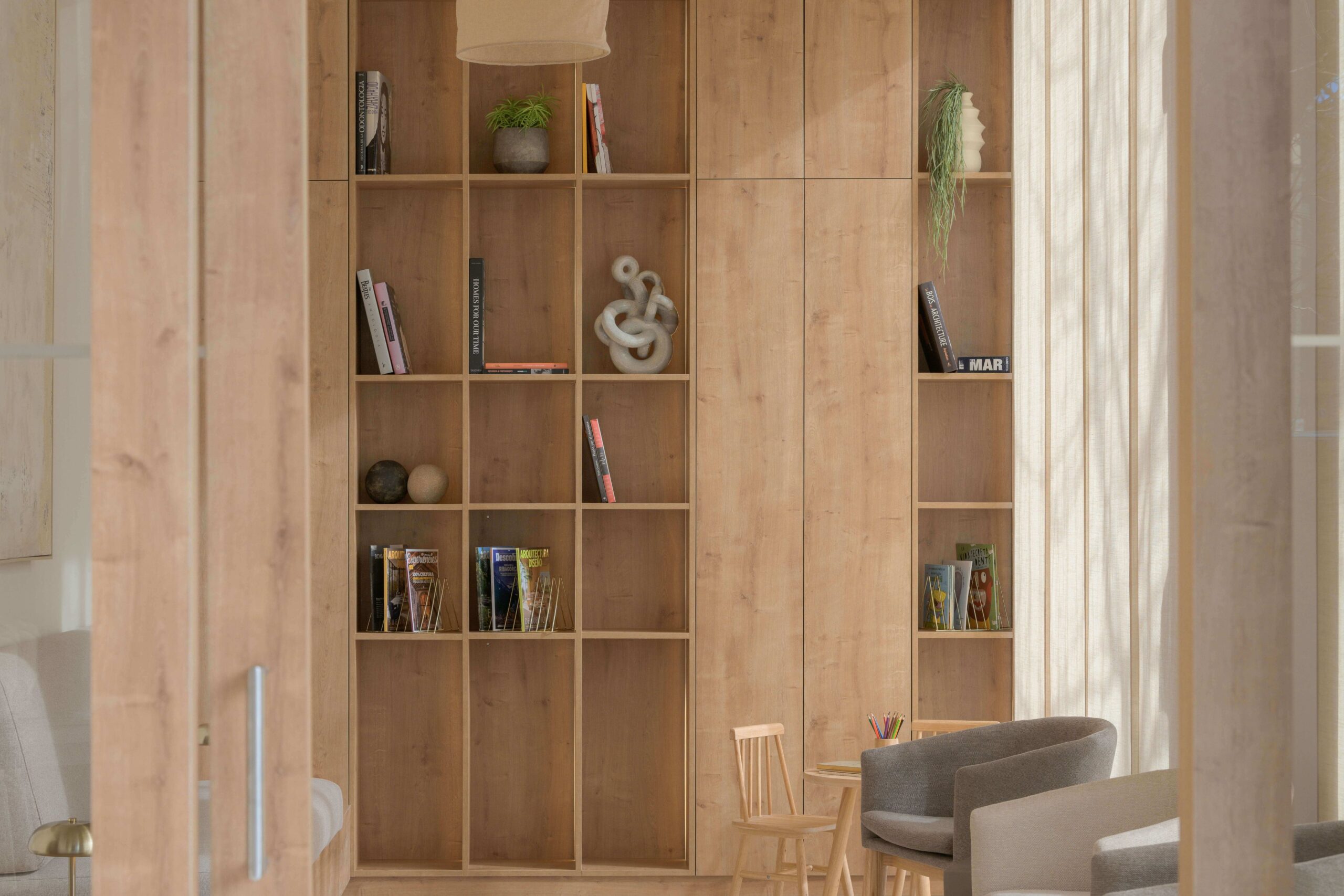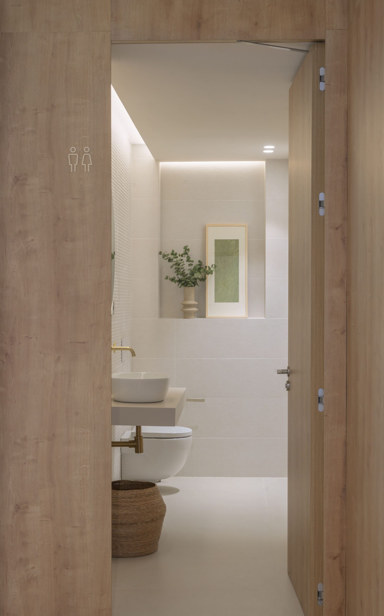 The space is conceived as an open and organized sequence, where light and materiality define the experience. Natural wood structures the whole and provides continuity, while textiles and neutral tones create comfort and serenity.