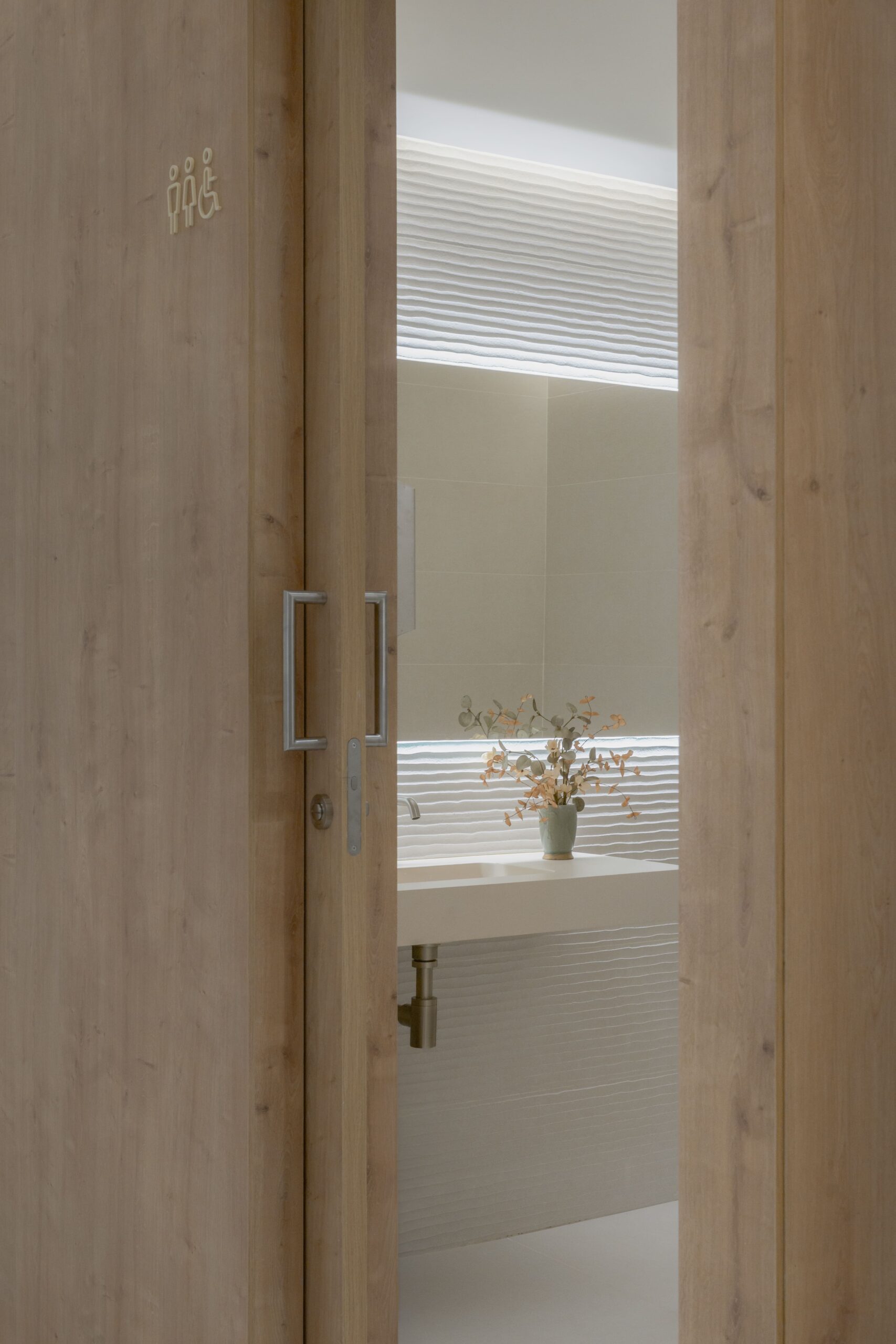 The treatment areas maintain the functional requirements of a clinic while incorporating the same material and lighting sensitivity. The aim is to reduce patient unease and create a more human-centered environment.